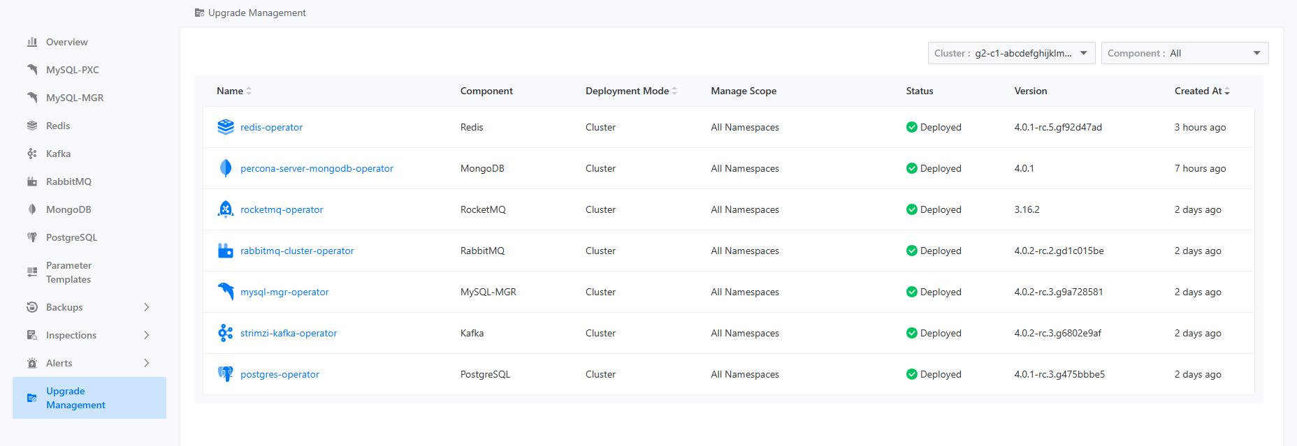 When users want to upgrade an instance, they can select the desired instance from the instance list and then click on the batch upgrade button in the upper right corner to trigger the rolling update for the corresponding instance. Users will observe that the status of the selected instances will sequentially change to Progressing. Once the instance update is completed, the status will change back to Running.