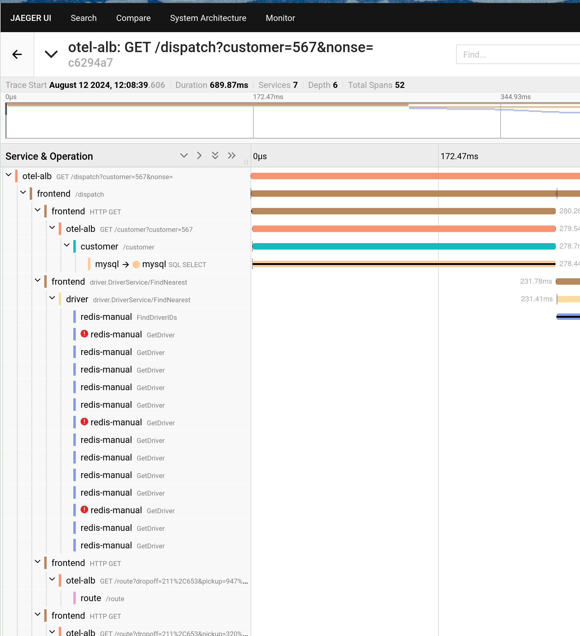 Execute the following command to send a request to HotROD via ALB. Here, ALB will report the Trace to Jaeger.